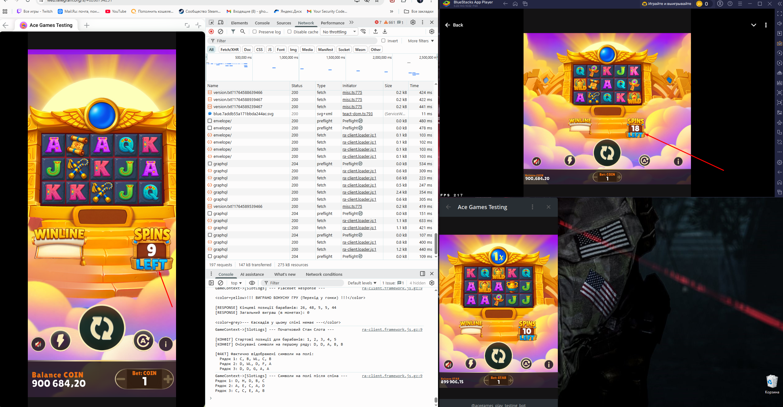 При игре с одного аккаунта на нескольких устройствах (телефон + ПК) происходит некорректная обработка бонусных игр. Если на телефоне выпадает бесплатная бонуска, и в этот же момент на ПК покупается бонуска, то количество спинов в бонусной игре удваивается.